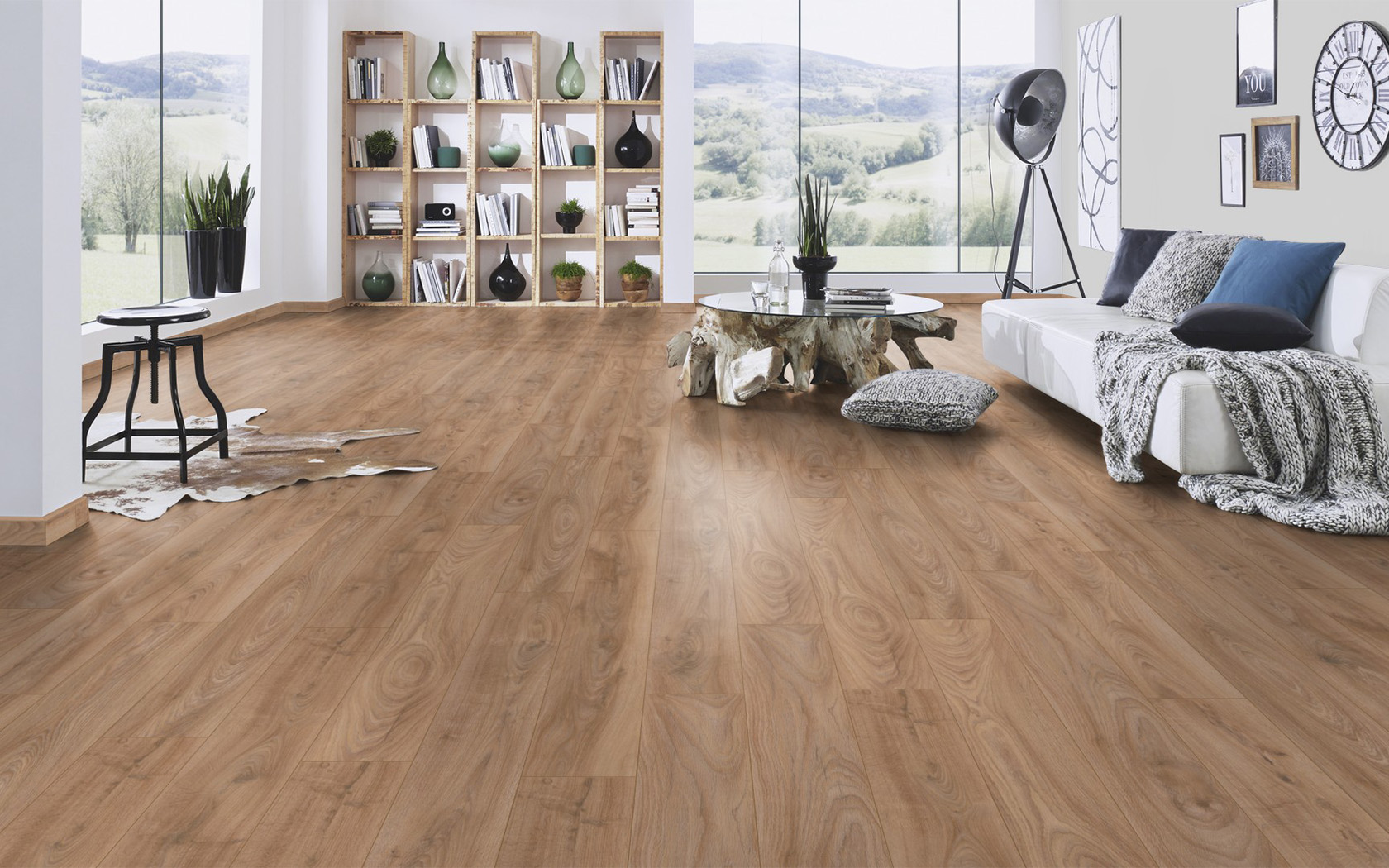 Το δάπεδο laminate έχει πάχος 10 mm, κατηγορία χρήσης 32 / AC4, αυλάκι σε σχήμα V στις τέσσερεις πλευρές και σύστημα συναρμολόγησης 1clic 2go pure.